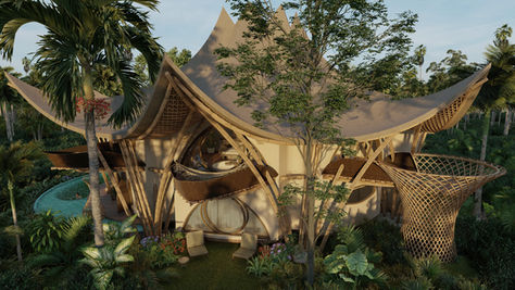 The project is a single-family house located in the Mayan jungle of Tulum. The shape with radial and modular symmetry resembles a lotus flower. With 3 suites, an office, multimedia room, yoga room and a living room with integrated kitchen, the house has 2 floors, as well as a tower with space for meditation and yoga. Its structure is a dialogue between the straight lines and curves of bamboo, which is used in several ways in the project. The house has large raw earth walls with a chukum finish - an ancestral Mayan technique that uses the bark of a local tree, has earthy tones and is waterproof* - and with its various facades, it integrates and dialogues with its surroundings.